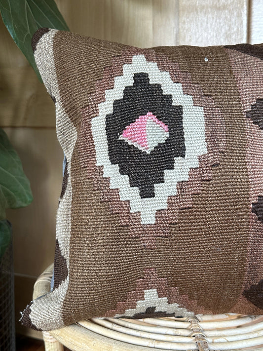 Brown and White Geometric Turkish Kilim Throw Pillow, 16 x 16