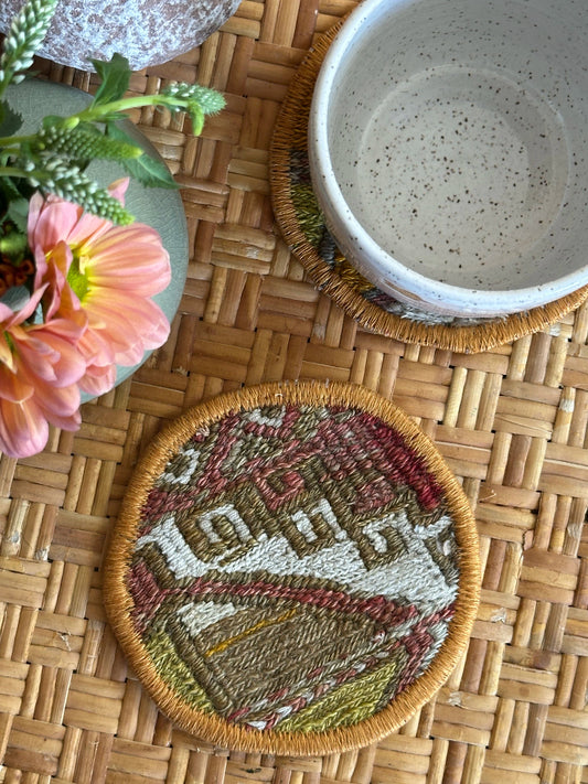 Turkish Rug Coaster Set - Multicolored Embroidered with Orange Stitching