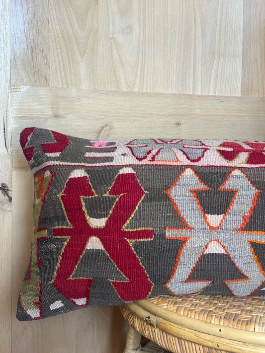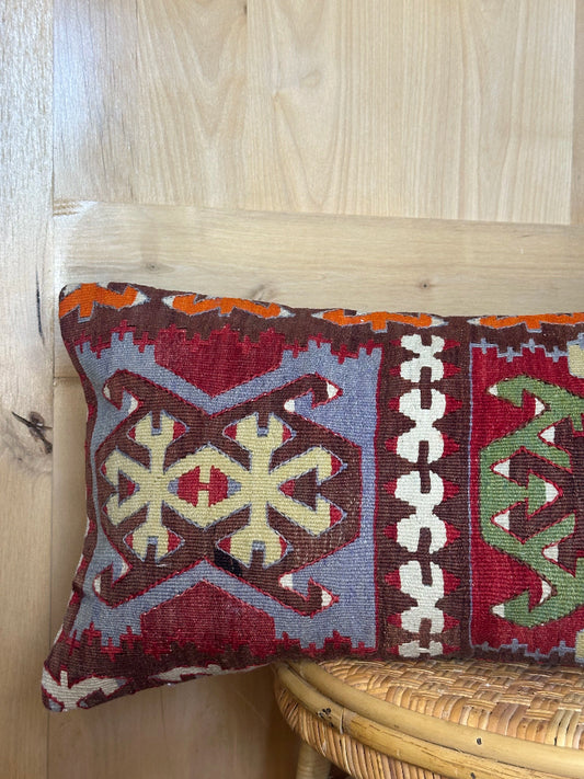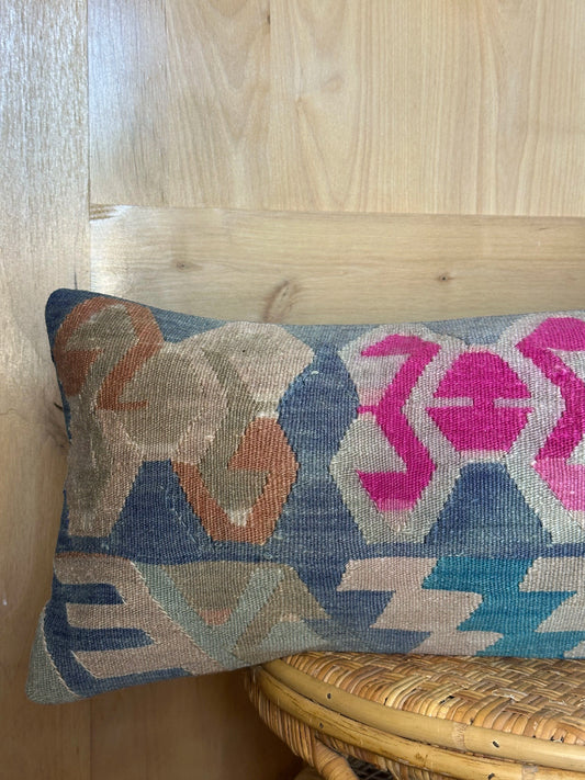 Multi-Color Geometric Turkish Kilim Lumbar Pillow, 12 x 36