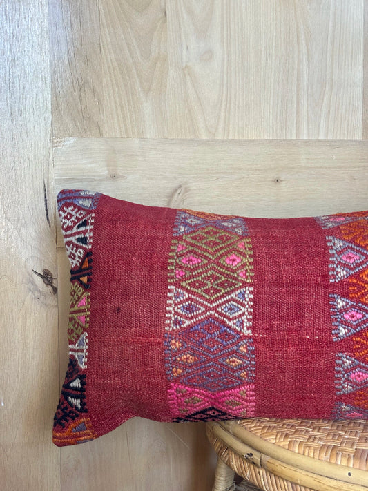 Colorful Magenta Embroidered Turkish Kilim Lumbar Pillow, 12 x 36