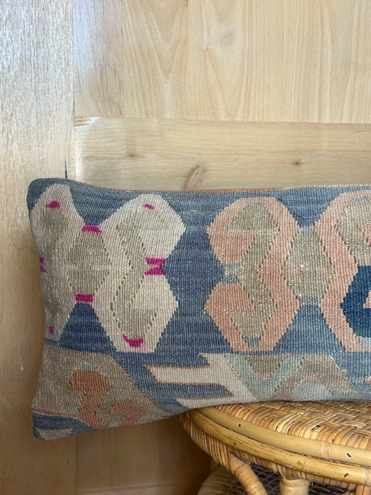 Blue Geometric Turkish Kilim Lumbar Pillow #2, 12 x 36