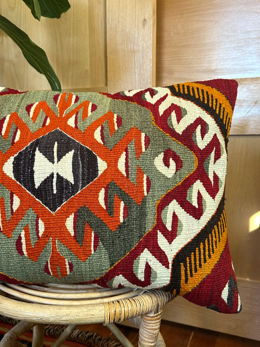 Green and Orange Geometric Turkish Kilim Lumbar Pillow, 16 x 24