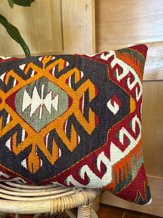 Red and Navy Geometric Turkish Kilim Lumbar Pillow, 16 x 24